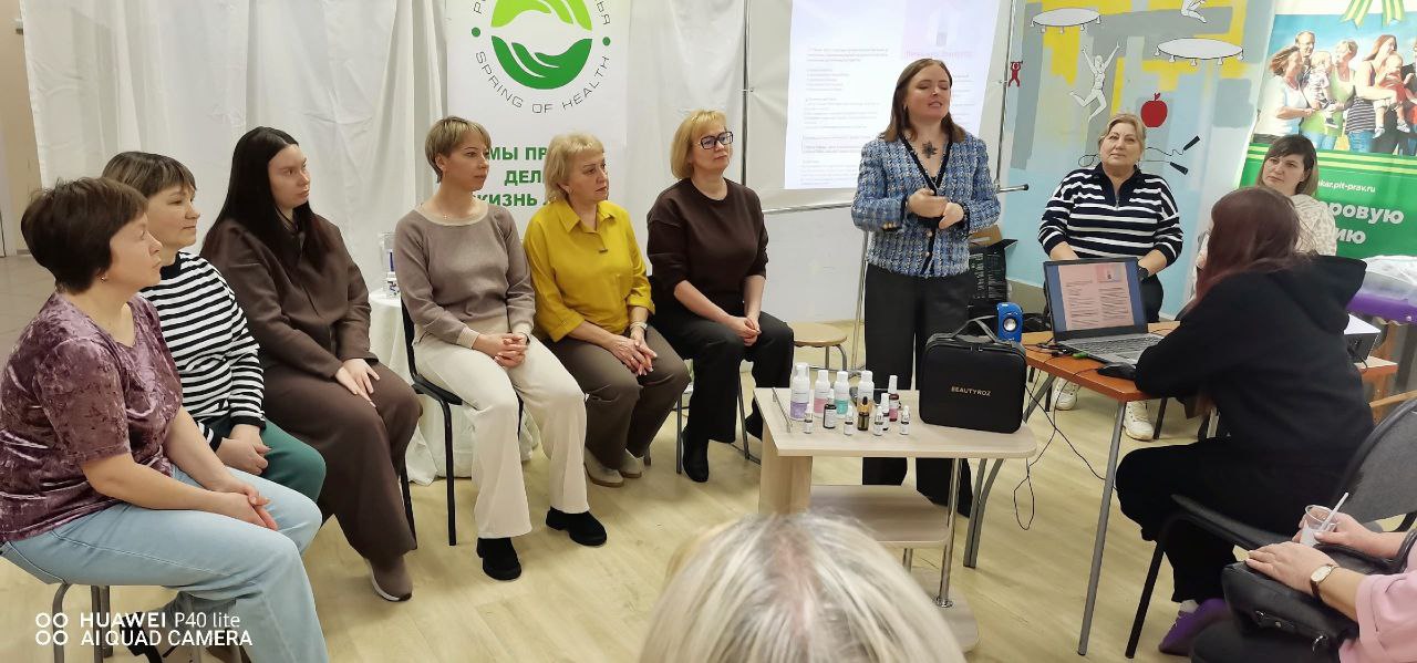 На лекции мы услышали новые бьюти-рецепты омоложения без инъекций и некоторые участницы протестировали новую косметику «Родника здоровья» на руке. Новая косметика Beauty ROZ с коллоидным золотом усиливает свое действие под фототерапией.