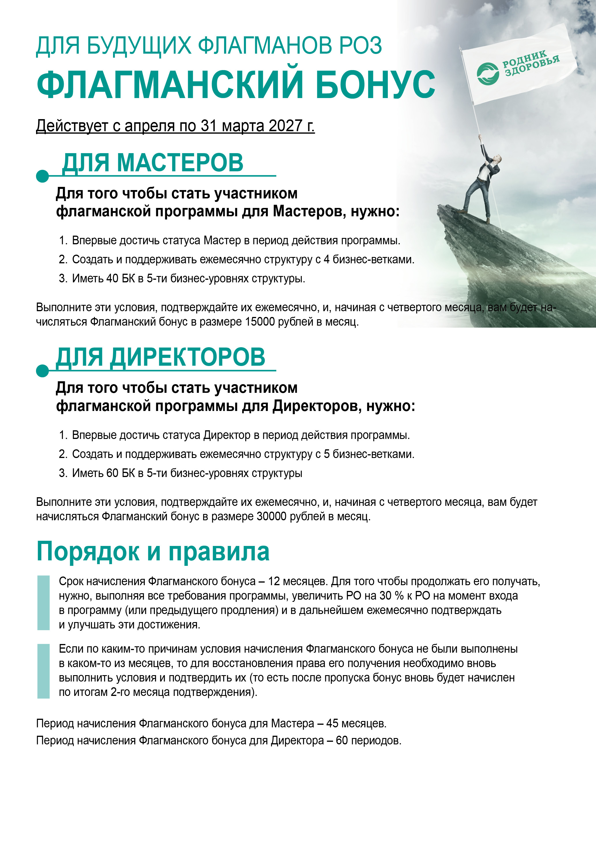Срок начисления Флагманского бонуса – 12 месяцев. Для того чтобы продолжать его получать, нужно, выполняя все требования программы, увеличить РО на 30 % к РО на момент входа в программу (или предыдущего продления) и в дальнейшем ежемесячно подтверждать и улучшать эти достижения.