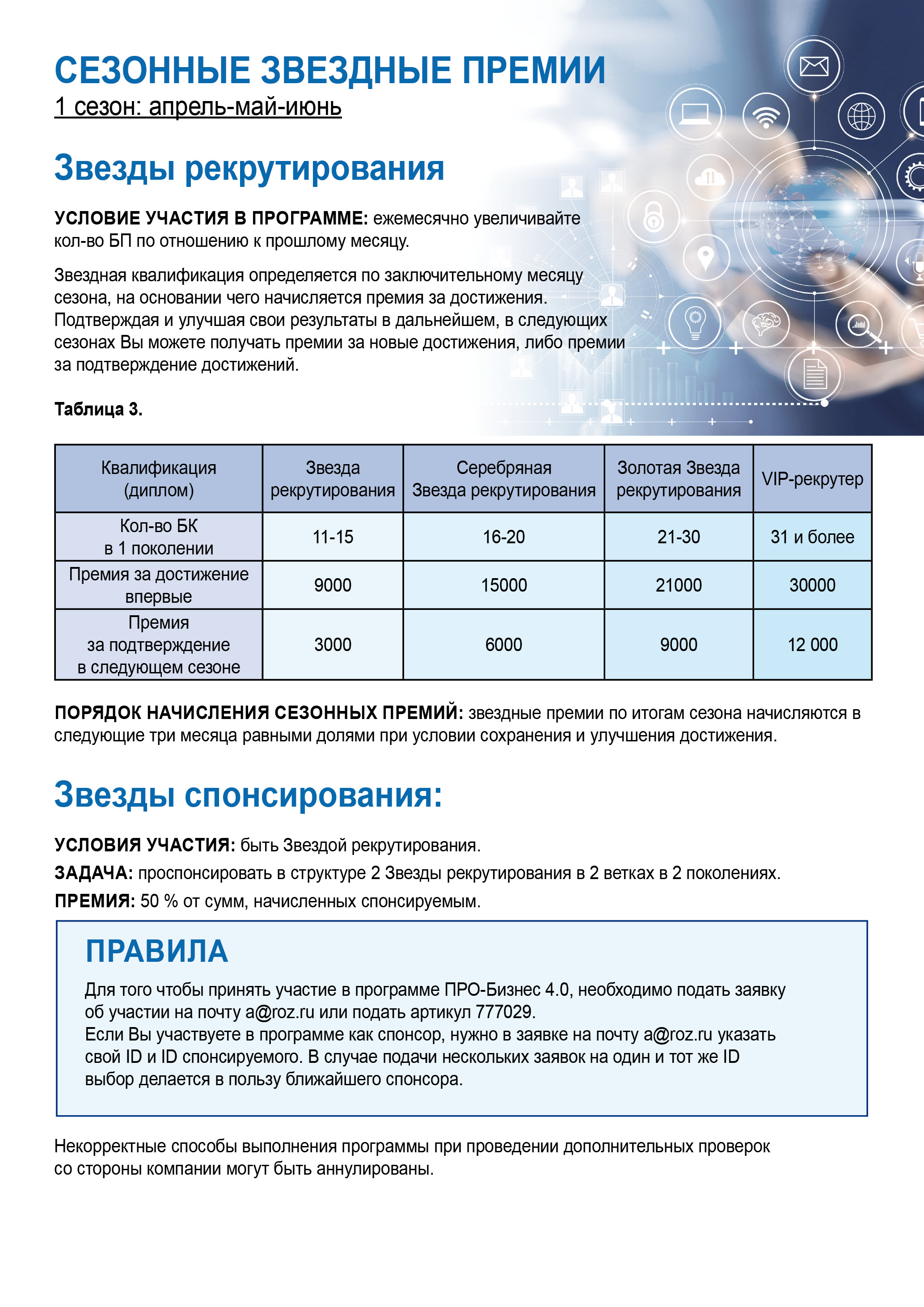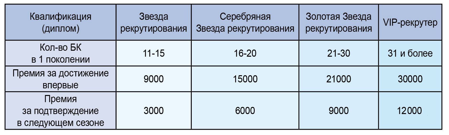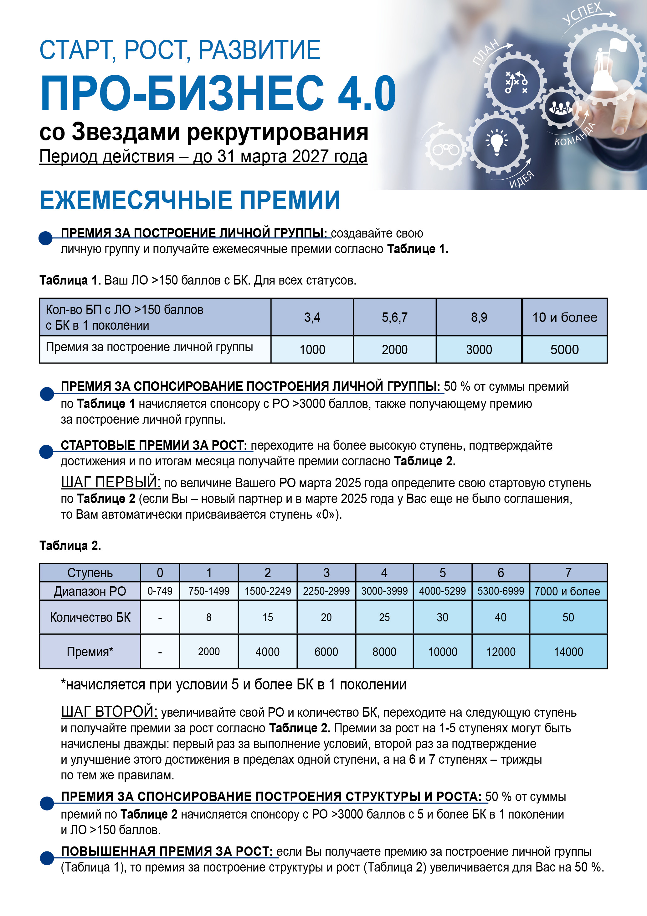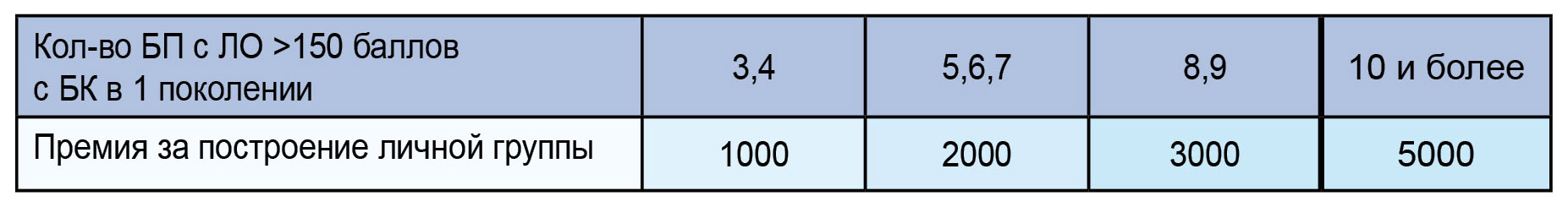 Премия за спонсирование построения структуры и роста: 50 % от суммы премий по Таблице 2 начисляется спонсору с РО >3000 баллов с 5 и более БК в 1 поколении и ЛО >150 баллов.