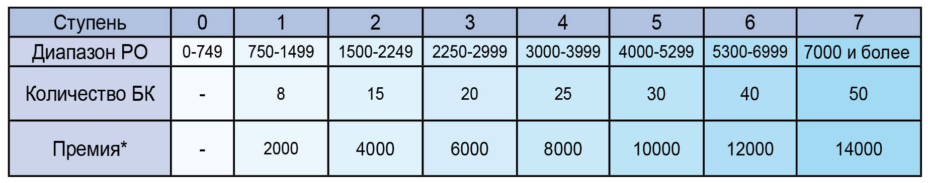 Шаг второй: увеличивайте свой РО и количество БК, переходите на следующую ступень и получайте премии за рост согласно Таблице 2. Премии за рост на 1-5 ступенях могут быть начислены дважды: первый раз за выполнение условий, второй раз за подтверждение и улучшение этого достижения в пределах одной ступени, а на 6 и 7 ступенях – трижды по тем же правилам.
